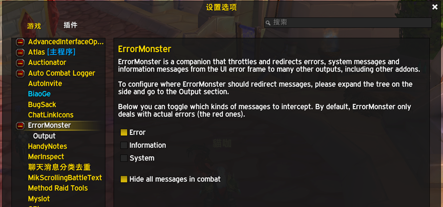 ErrorMonster:隐藏游戏错误红字与音效,比如“我还不能施放这个法术”“法术还没有准备好”“需要:扳手”等等此类提示。如果你需要这些提示,那么禁用该插件。