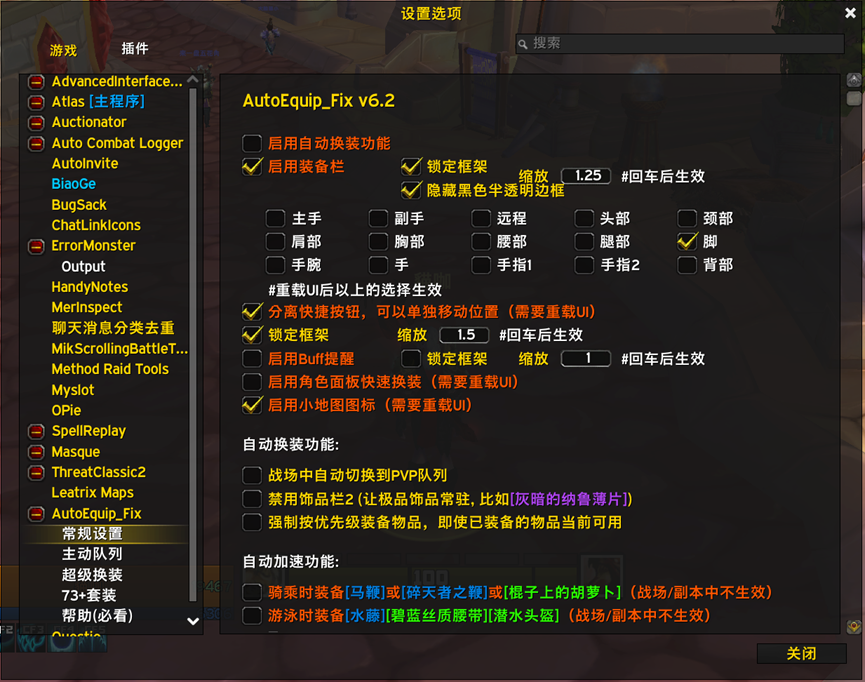 AutoEquip 和AutoEquip_Fix:TBC阶段主推的换装插件,WLK作者已退坑不再更新,因此我修复出Fix版,可供WLK使用。需要禁用AutoEquip,启用AutoEquip_Fix,即可正常使用。