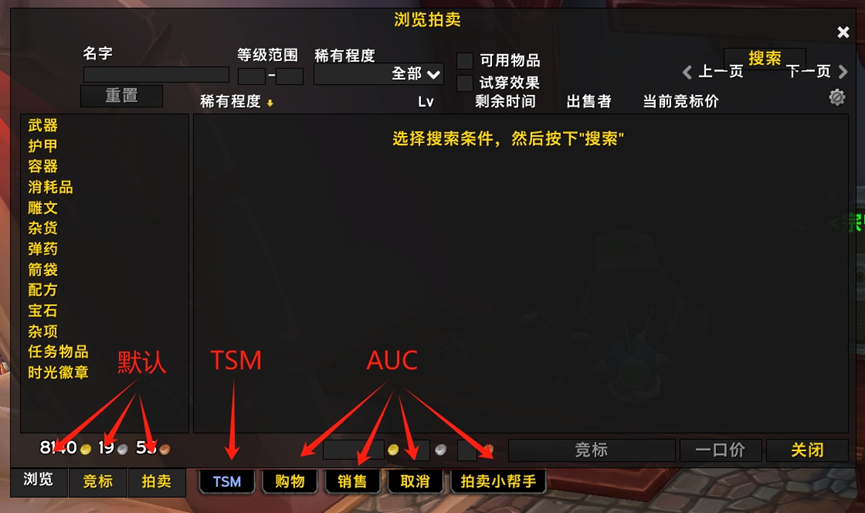 Auctionator 和 TradeSkillMaster :两款拍卖行插件,TSM有更好的搜索功能,但出售物品功能不方便学习成本高,故建议购买使用TSM、出售使用AUC。