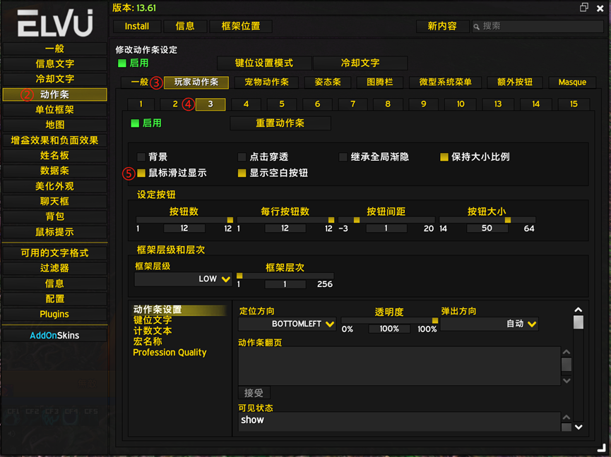 ①输入/EC 打开Elvui配置界面,依图顺序②-⑤取消勾选“鼠标滑过显示”,对3-6号动作条均进行该操作即可。