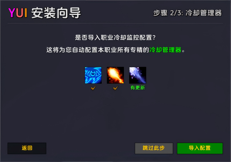 - 首次进入游戏,将自动弹出【YUI安装向导】,一键导入【编辑模式】【冷却管理器】【中央资源条】配置。