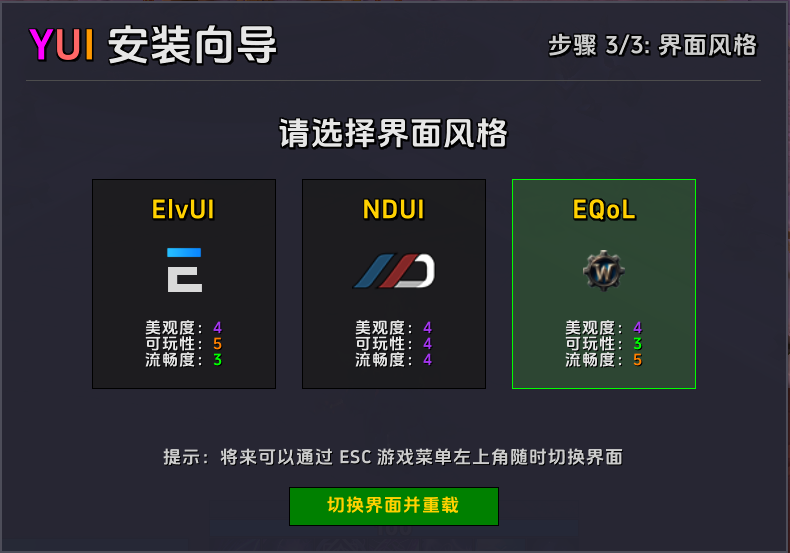 2. 一键切换:ElvUI(功能强大) / NDUI(超级全面) / EQoL(打团超流畅)