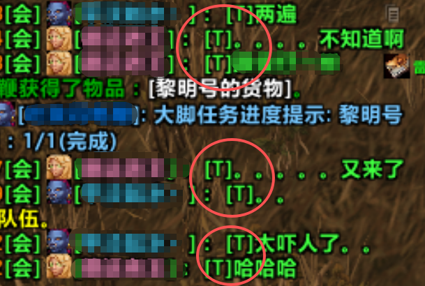 再次提醒:如果你的公会聊天在疯狂复读机刷屏,前面还带个[T]字(如下图),请务必自行在:新手盒子-本地插件-删除ChatTransmit单体插件