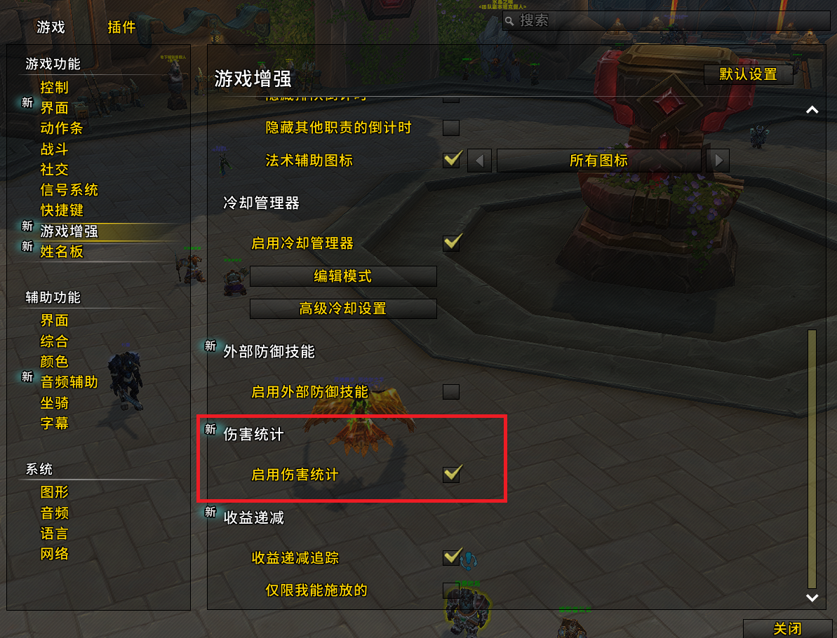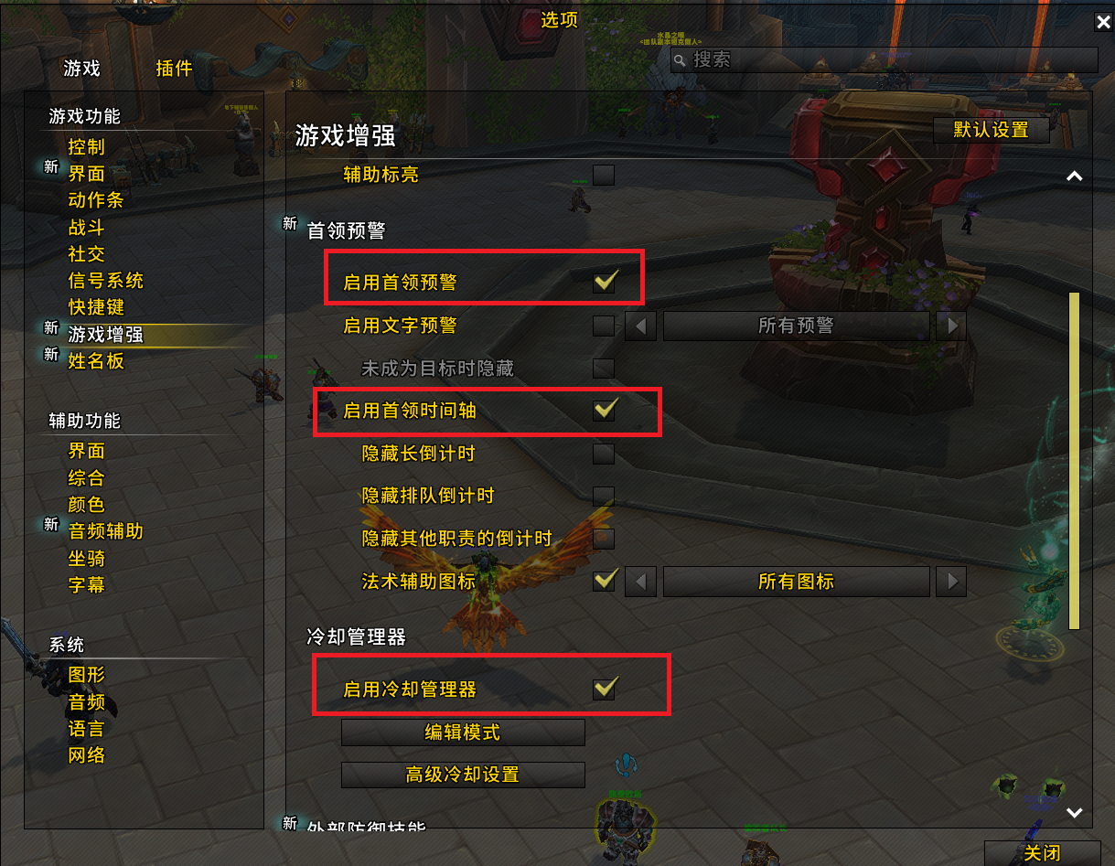 5、进入游戏后,ESC-选项-游戏增强 将启用首领预警 启用首领时间轴 启用冷却管理器 启用伤害统计勾选上