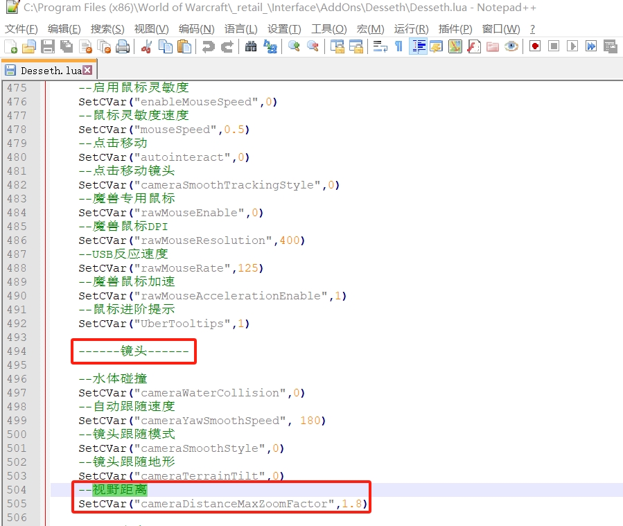 如果觉得视角太近,可以打开文件 World of Warcraft\_retail_\Interface\AddOns\Desseth 中的 Desseth.lua 文件