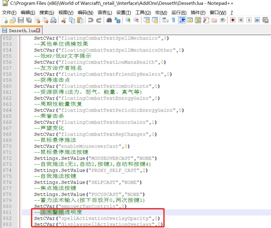 如果想要显示法术警报(人物两侧触发的括号),可以打开文件 World of Warcraft\_retail_\Interface\AddOns\Desseth 中的 Desseth.lua 文件
