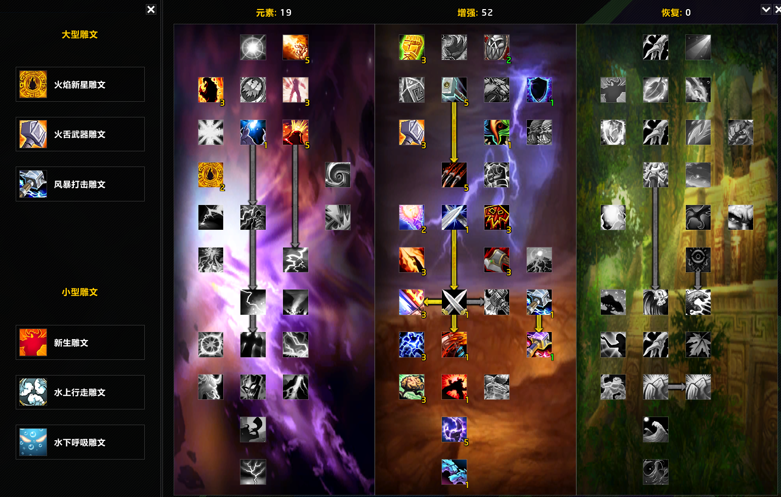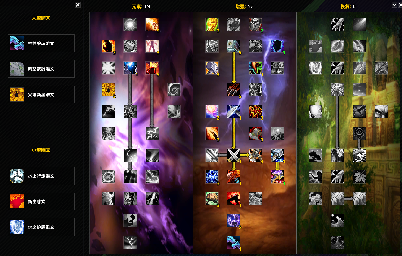 增强第1排第1个“强化图腾”,只要你的装备到P2级别,对你个人的收益已经不如第3个“先祖知识”,可以移过去点满智力,但对团队收益来说,还是建议点“强化图腾”
