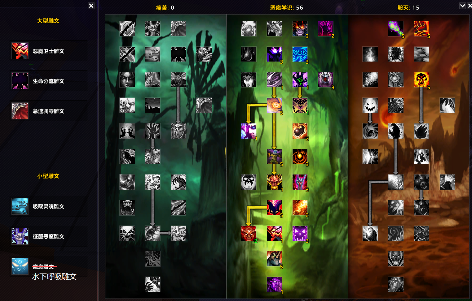 小雕文:吸取灵魂+征服恶魔+水下呼吸(拍卖行搜:水下呼吸,注意购买术士用的,安装后显示为魔息)