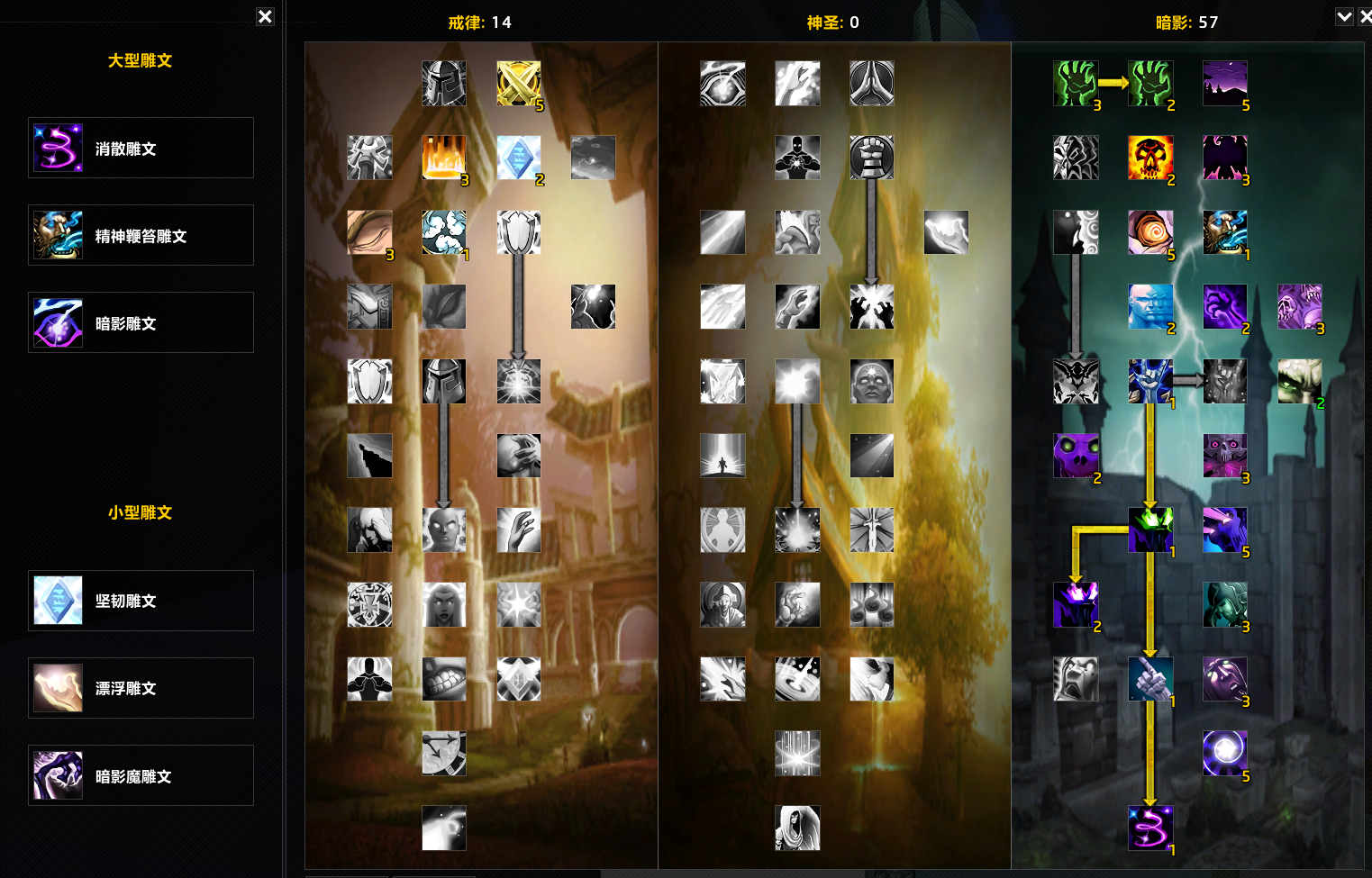 若经常打5人本,或AOE较多的BOSS,可将“消散雕文”换成“精神灼烧雕文”