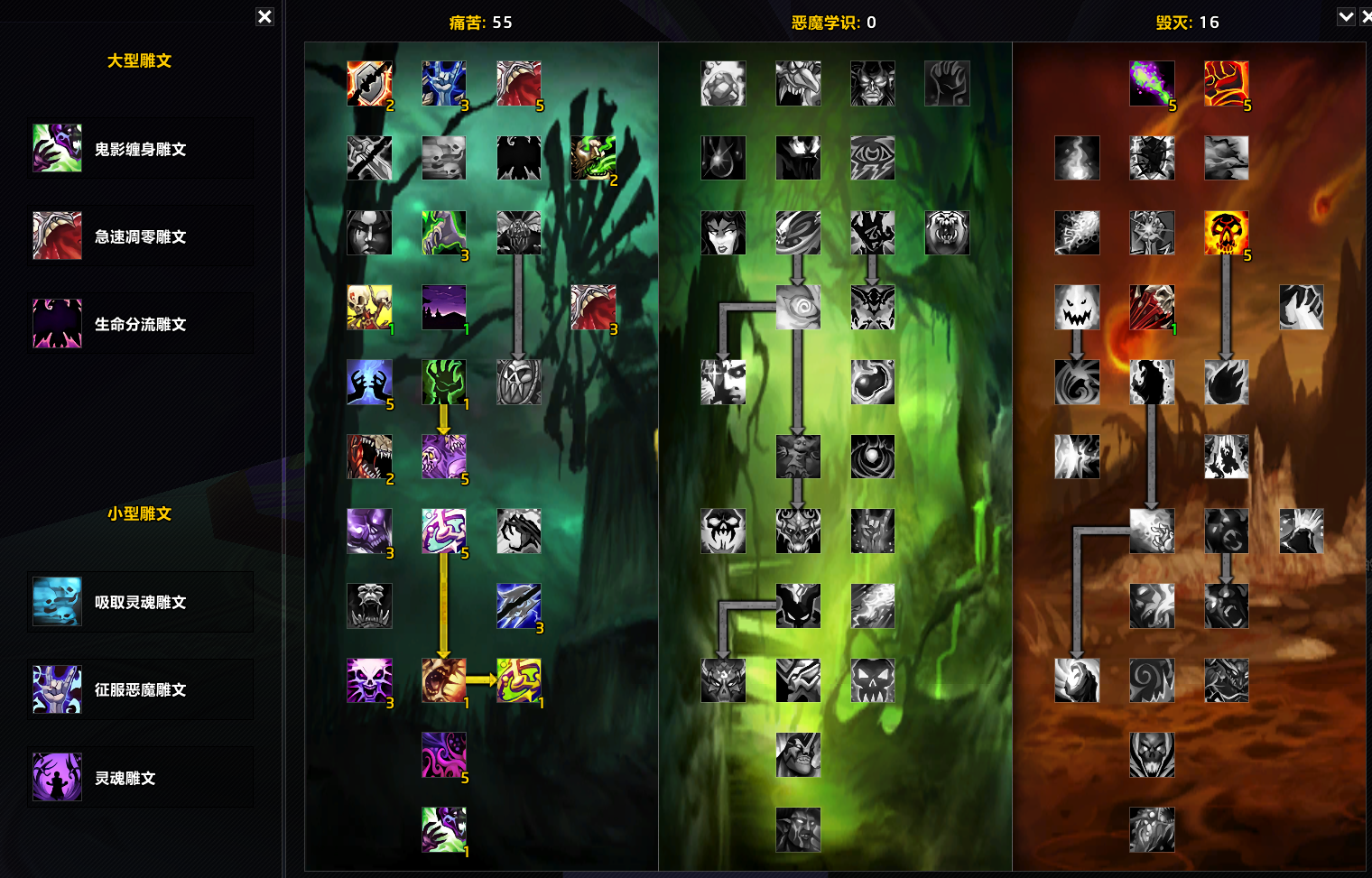小雕文:吸取灵魂+征服恶魔+灵魂 或:水下呼吸(拍卖行搜:水下呼吸,注意购买术士用的,安装后显示为魔息)