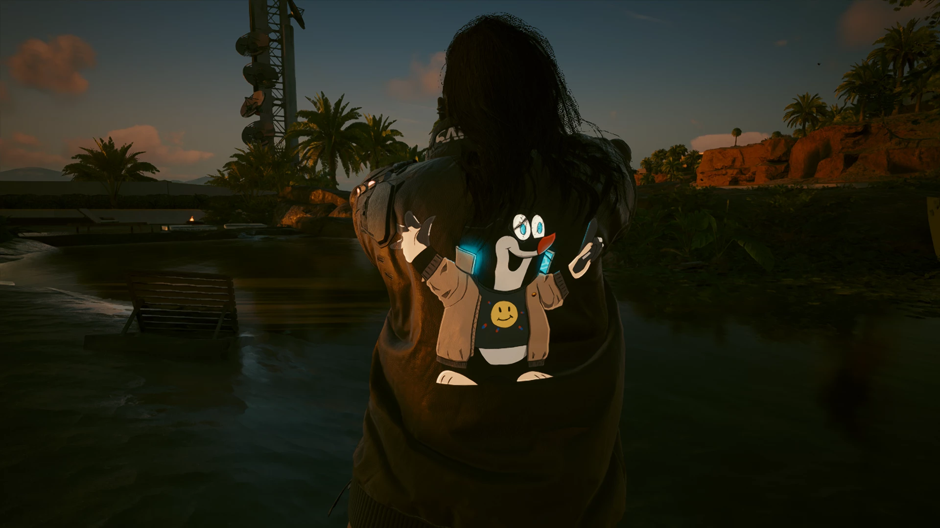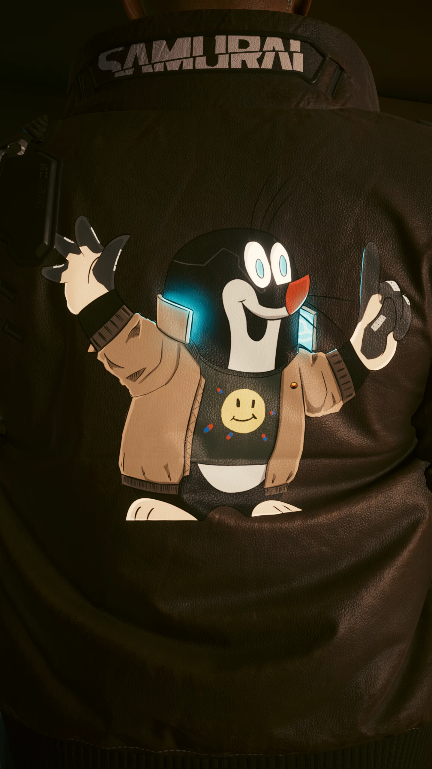 我将约翰尼夹克上原有的武士标志替换成了我之前画的一只小鼹鼠图案。 将存档文件放入你的 Cyberpunk 2077\archive\pc\mod 文件夹中,简单轻松。