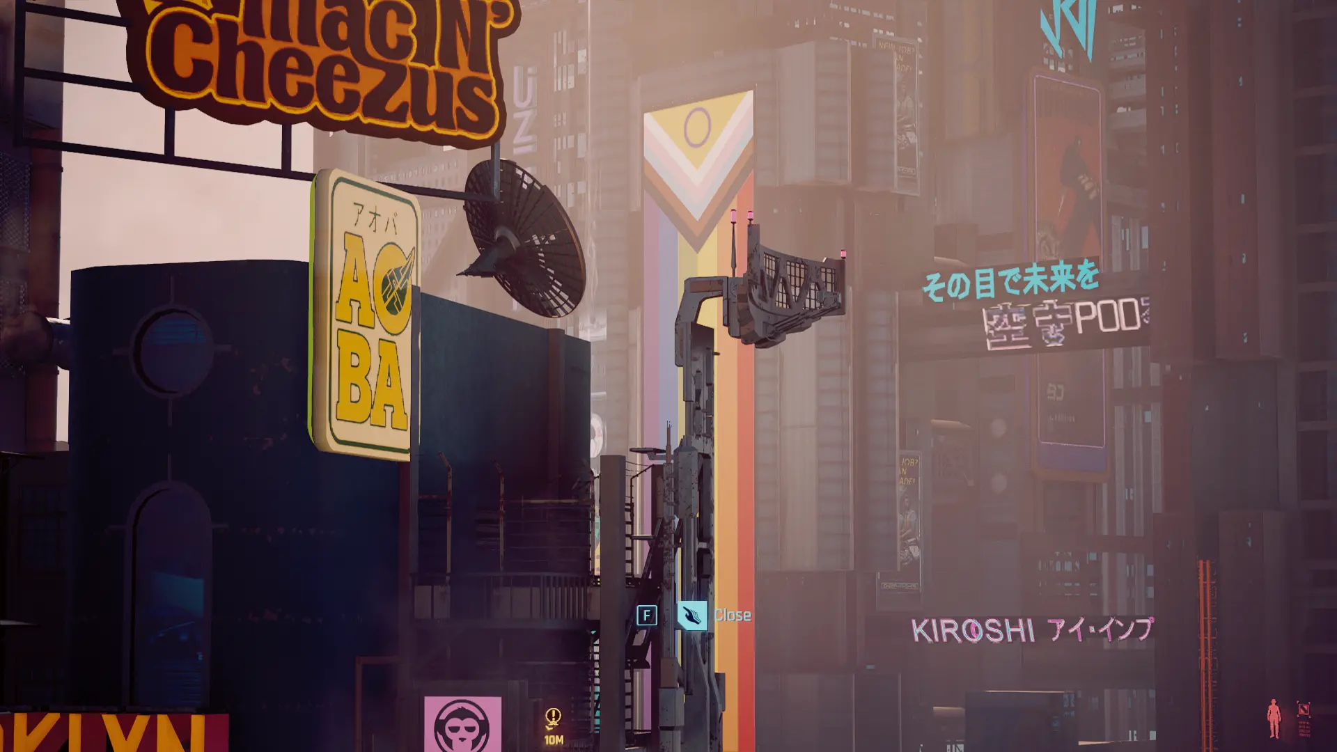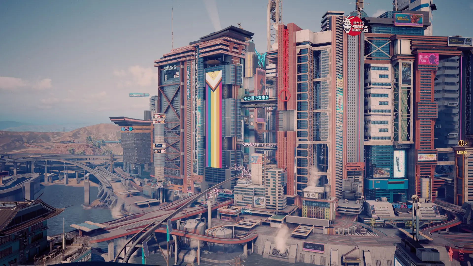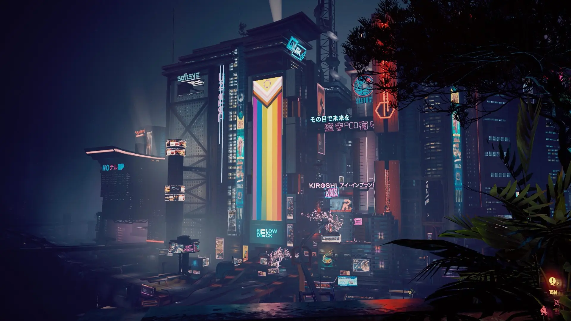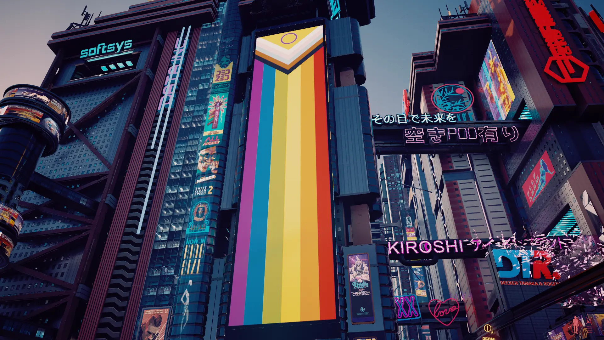 这个模组将小中国和日本城之间的大型面部广告牌改为一面全包容的彩虹旗。 1、广告牌具有变色视觉效果,使骄傲旗帜呈现出一种色彩变换的动画效果。 1、从公寓可以看到megabuilding hq10上的旗帜