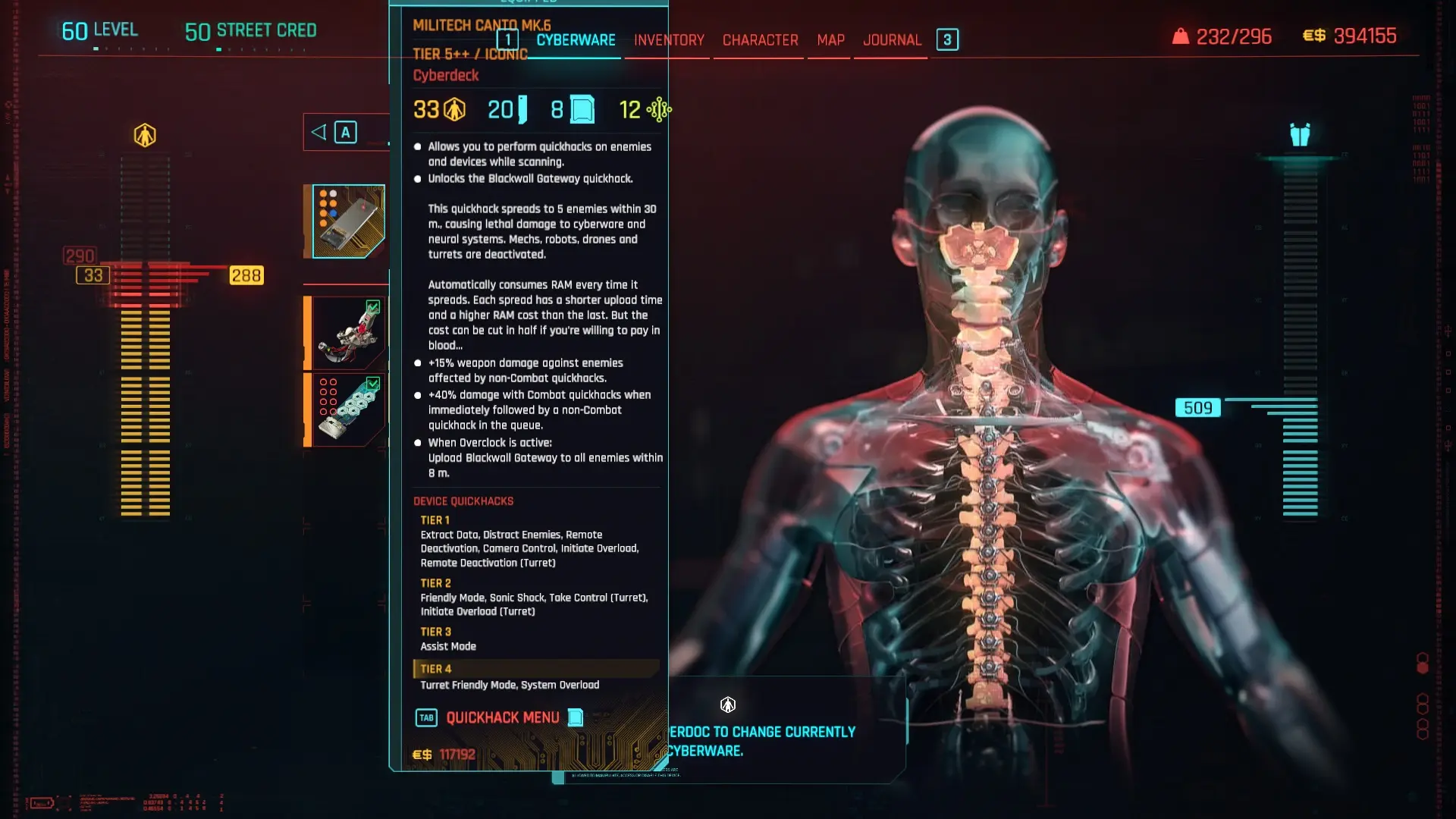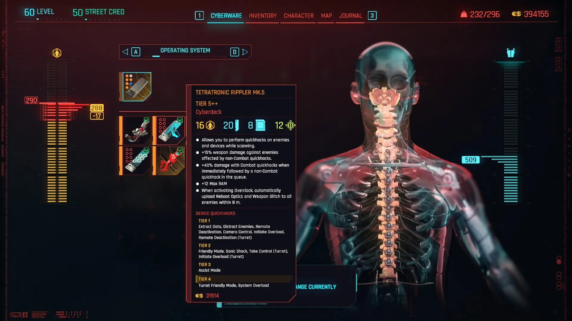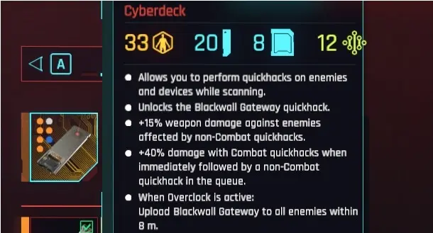 所有更改 赛博义体数值: 33 义体容量(未改变) 20 最大RAM 8 快速破解槽位(7+1用于黑墙网关) 网络义体能力: +15% 对受非战斗快速黑客影响的敌人的武器伤害 +40%