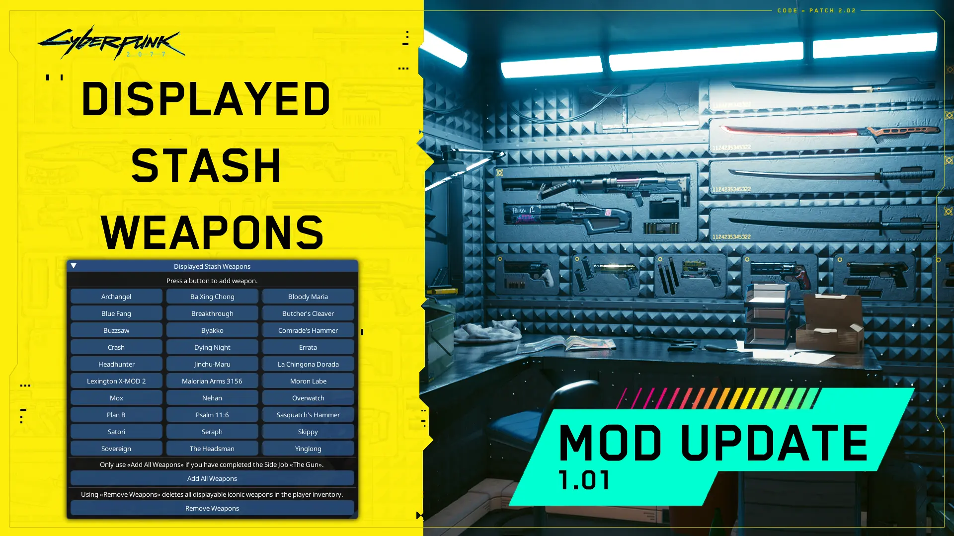 01 描述 目前存在一个错误,导致某些标志性武器无法在储物墙展示,我制作了这个模组作为临时修复方案,直到CDPR发布解决此问题的补丁。 使用这个模组,你可以通过简单的UI界面一键将存在漏洞