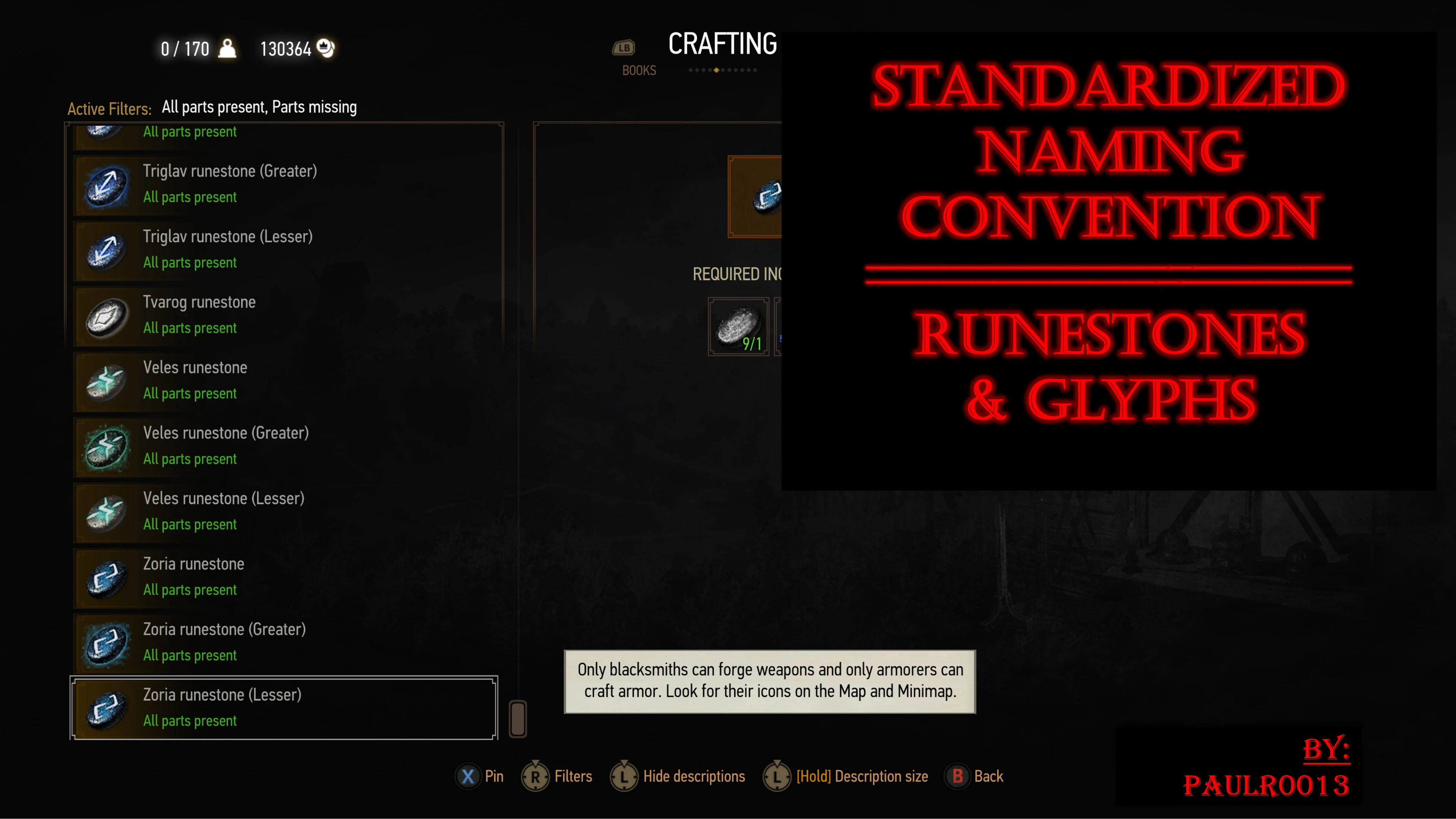 概述 修改了符文石和雕文的命名规则,使它们在物品栏/制作菜单中能够归类在一起。 推荐配套模组 我推荐将此模组与标准化命名规范(SNC)系列的其他模组搭配使用: