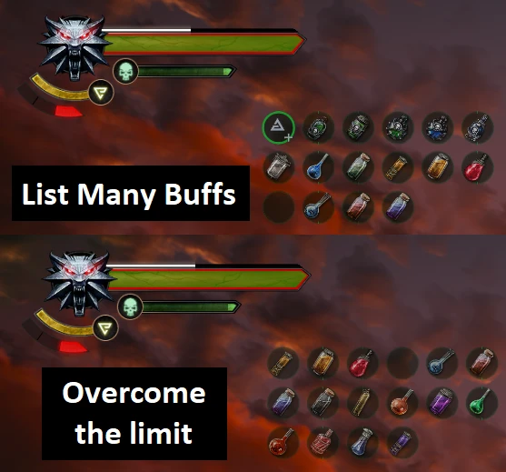 这个模组让你能在激活效果数量超出显示限制时,通过按钮控制的分页形式查看额外的激活效果。 1. When the number of active effects exceeds the displa