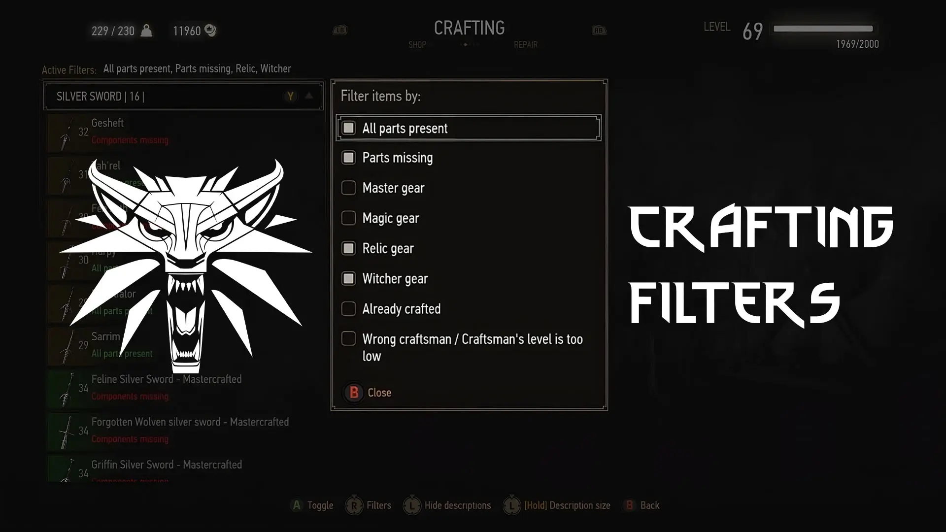 描述 这个模组为武器和护甲的制造菜单新增了筛选选项。制造组件不会受到这些筛选器的影响。 大师装备:显示/隐藏大师品质装备。 魔法装备:显示/隐藏魔法品质装备。 遗物装备:显示/隐藏遗物品质装备