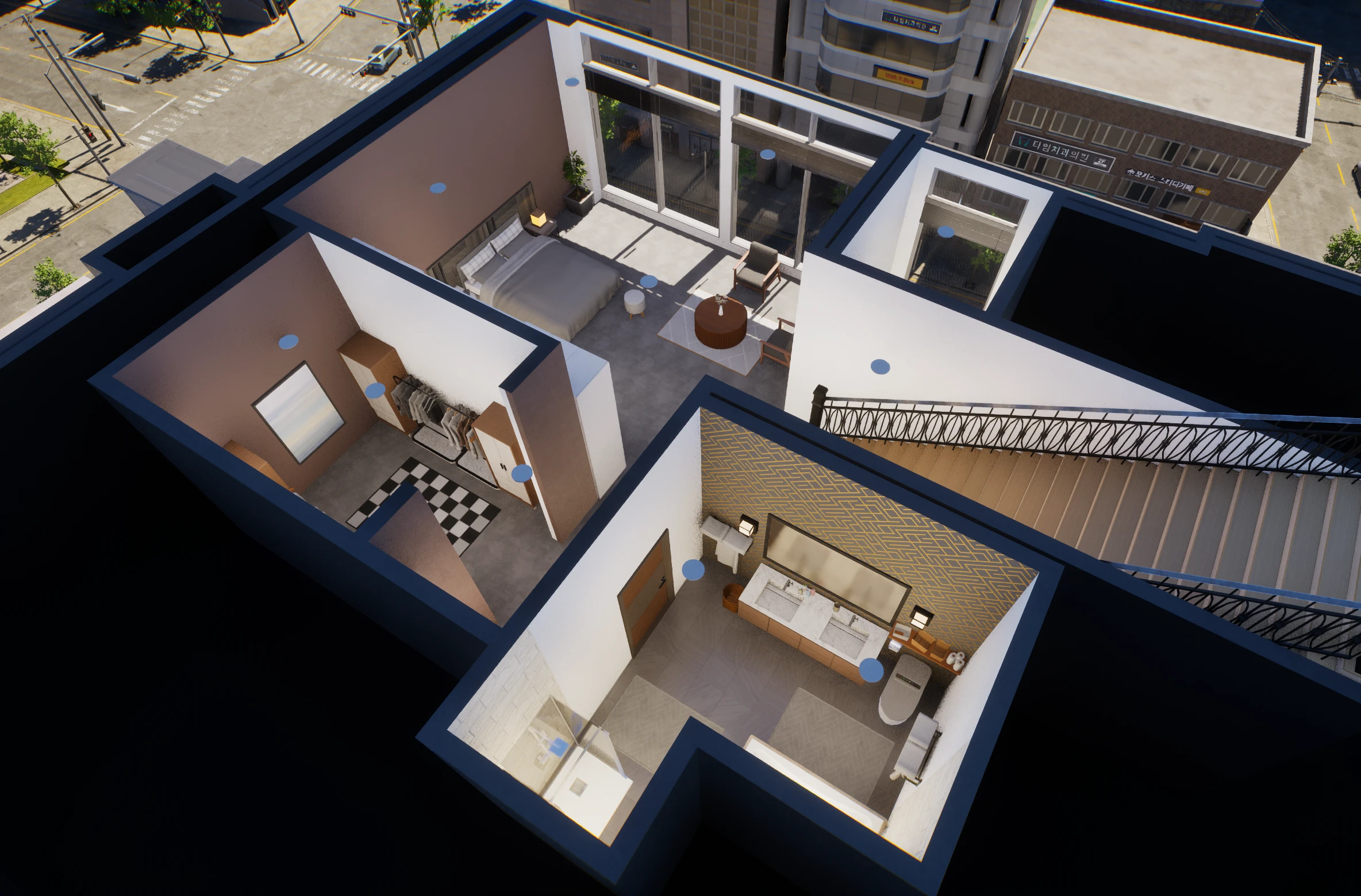 嘿呀 我在此分享我的首批作品!这是一座名为"日蚀塔"的定制建筑,内部设有4套顶层公寓,旨在还原GTA线上模式中的公寓风格。 顶层两套顶层公寓最为精确,但ZOI无法正常使用,因此我在下方制作了两套经过游
